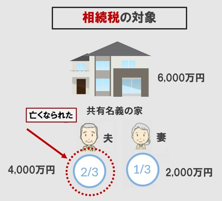 例えば、評価額6,000万円の不動産を夫婦で夫が3分2,妻が3分の1ずつ共有していた場合、夫が亡くなった際に相続税の対象となるのは夫の持分である4,000万円分だけです。