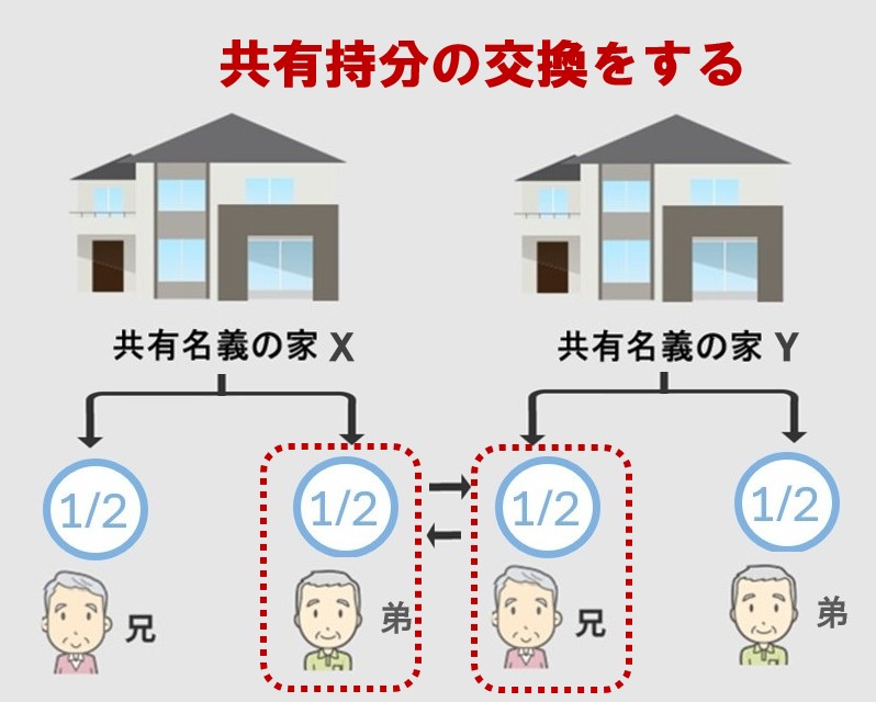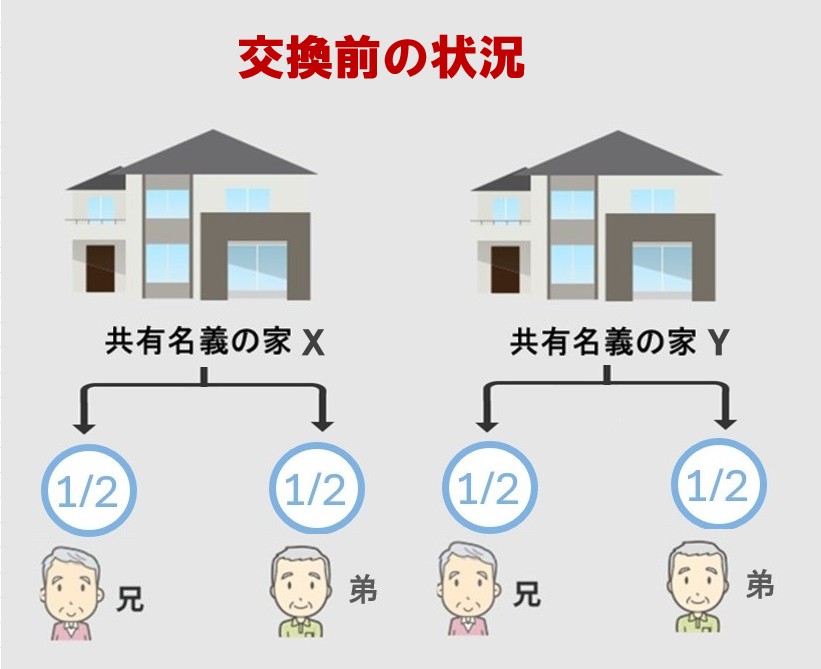 例えば、交換前の状況で、兄と弟が共有で所有している2つの家(XとY)があり、それぞれの持分は2分の1とします。