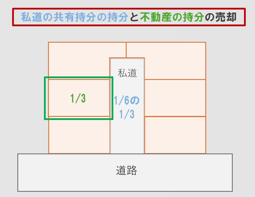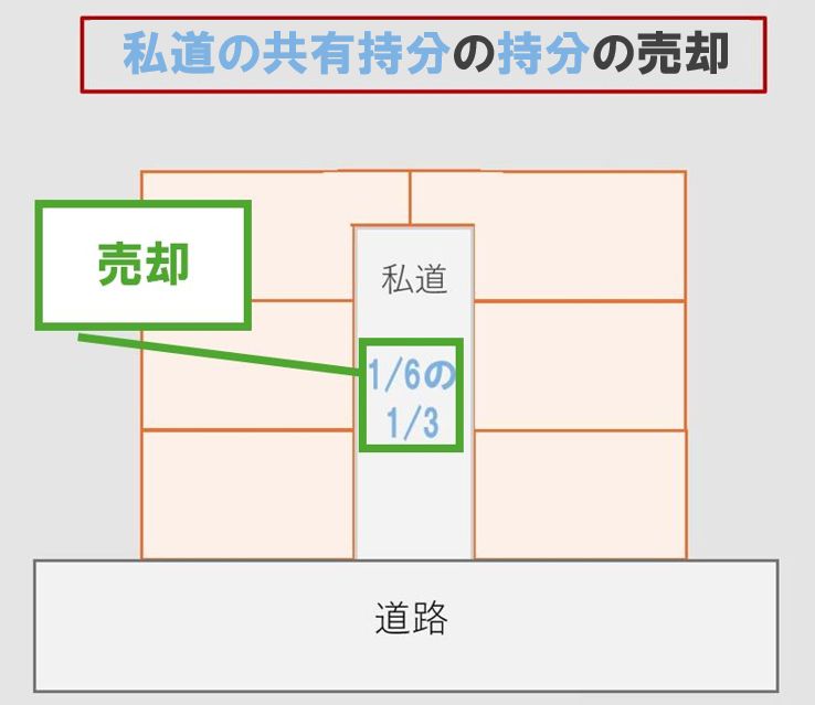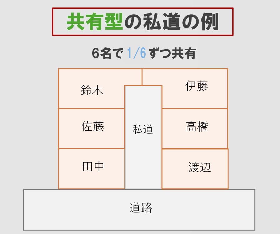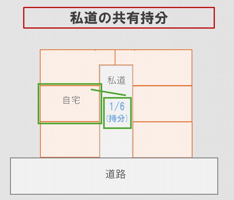 なお、「共有持分の私道」とは、1つの私道を複数人で所有しており、各共有者が持分に応じて権利を持っている私道のことです。