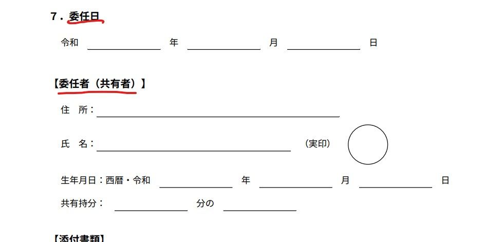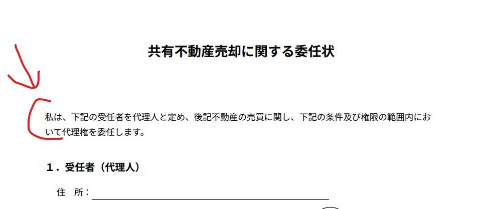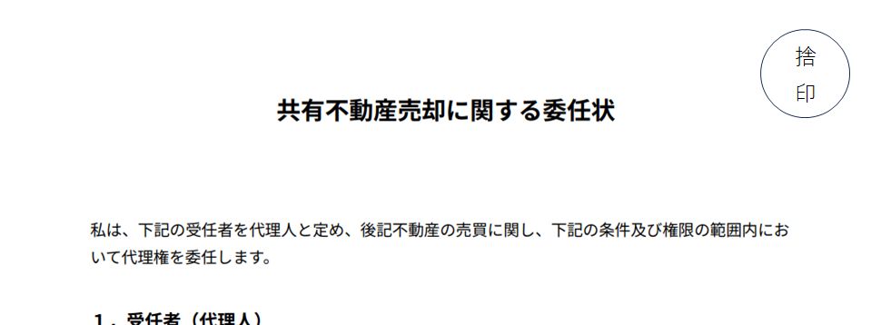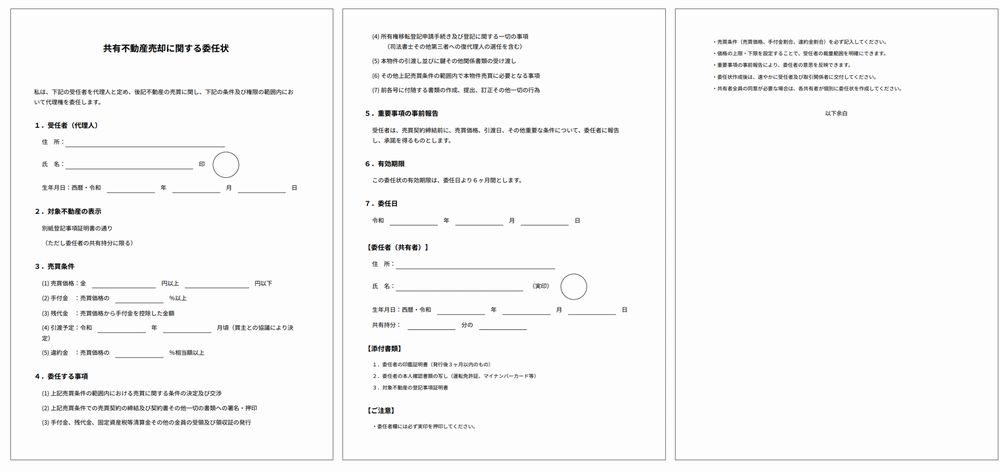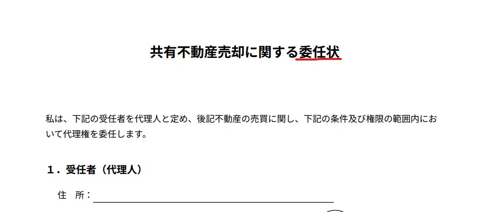 売却手続きに立ち会えない共有者がいる場合、代表者に渡す委任状を作成します。