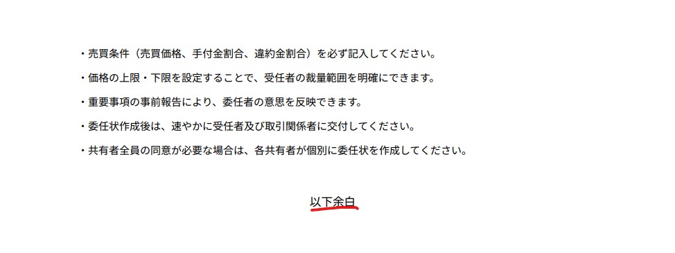 委任状の記載が終わったら、文末に「以下余白」と書き加えてください。