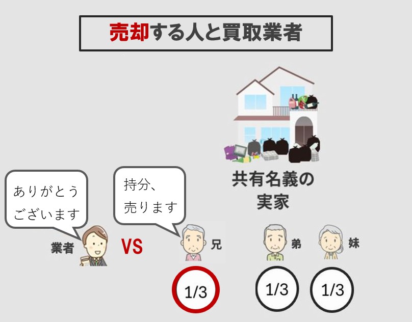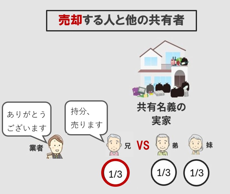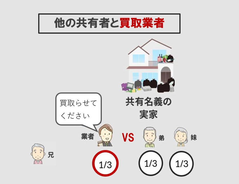 例えば、三人兄弟の共有名義で相続した戸建があり、長男が固定資産税やリフォーム代を立替えた後に、三男が持分を買取業者へ売却した場合、長男はその立替分を三男か買取業者に請求できるということです。