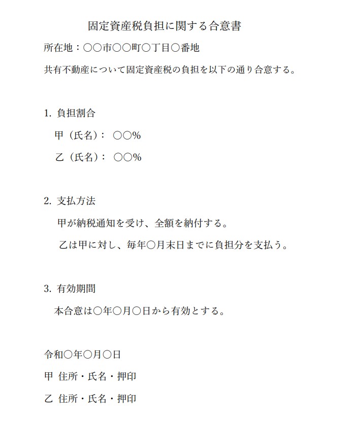 こちらに「固定資産税負担に関する合意書」のひな型がございますので、必要な方はチェックしてみてください。