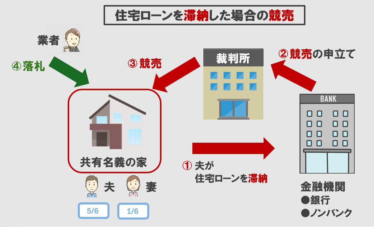 例えば、夫婦が共同で住宅ローンを支払っていたが、滞納してしまった場合、最終的に共有不動産全体の競売になります。