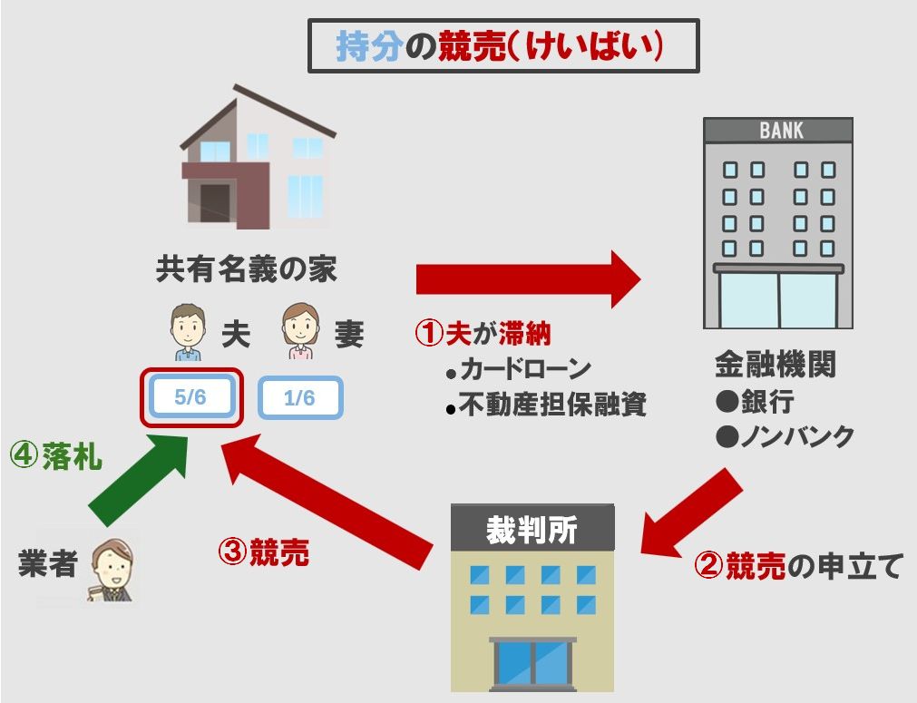 例えば、夫婦で共有名義にしている住居があり、夫がカードローンを滞納した場合、夫の持分が競売の対象になるということです。