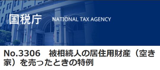 空き家特例についの詳細は「国税庁HP(No.3306 被相続人の居住用財産(空き家)を売ったときの特例)」をご覧になってください。