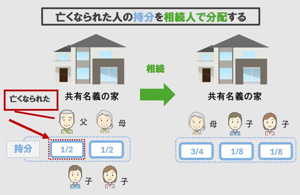 相続が発生すると、故人の持分は法定相続分の割合で相続人全員の共有状態になります。