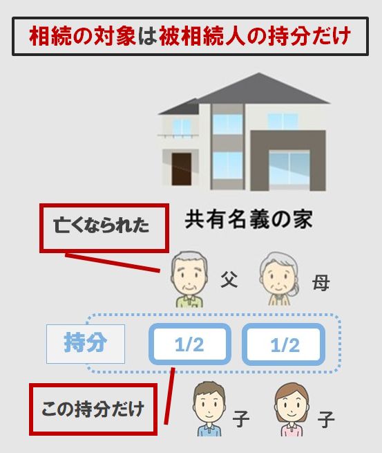 配偶者や親、兄弟・姉妹などと2人で共有名義にしている不動産があり、片方が他界した場合、相続の対象となるのは、他界した人の持分だけです。